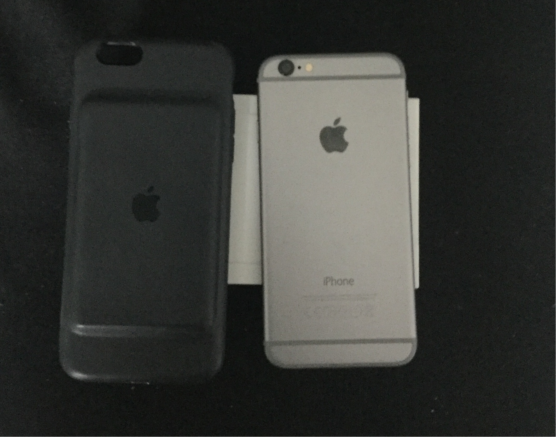 iPhone 6 64GB spacegray met batterijhoesje voorzien van een Anker Glassguard screenprotector met lightning kabel een stekker.