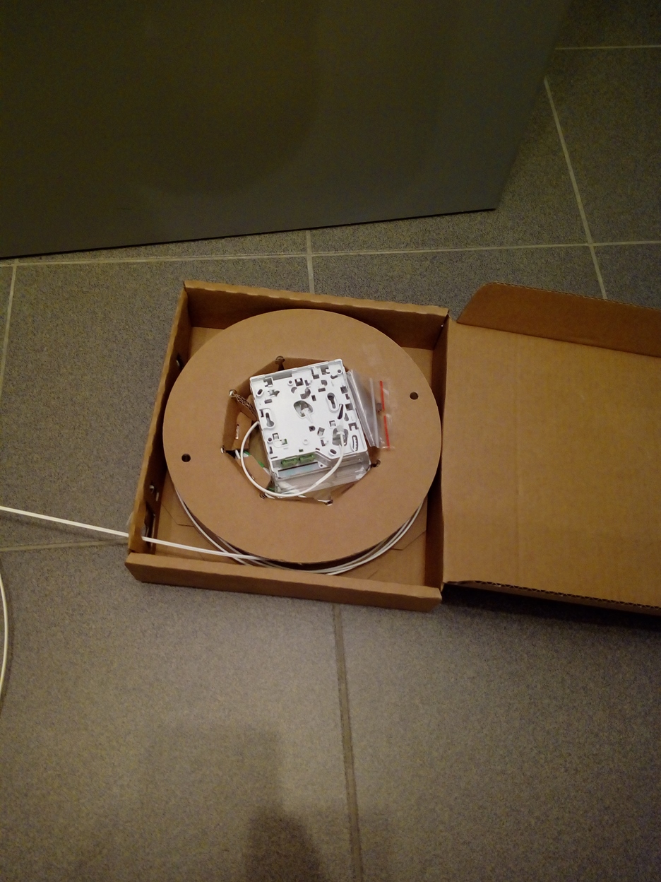 -de ONTP zit geboxed in een doos met 25meter fiber reeds verbonden, gewoon afrolbaar voor installatie, handig dus.