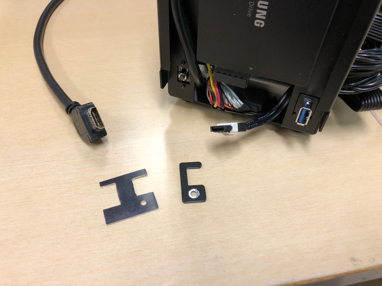Ik heb uit aluminium het "houdertje" van de bestaande USB aansluiting nagemaakt, met aan de tegenovergestelde kant een extra bevestigingspunt voor de HDMI kabel.