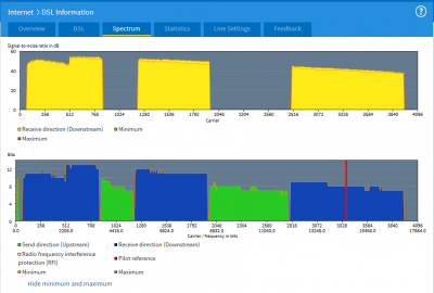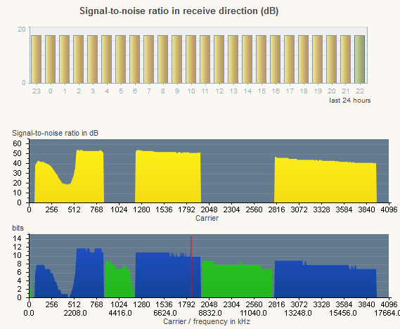 Ik vraag me wel af hoe jij kan zien dat je attainable upload met 8% gezakt is in het spectrum. De bovenste grafiek geeft enkel de SNR weer per carrier van de downstream en het is normaal dat de SNR zakt naarmate de frequentie (carriernummer) toeneemt. De onderste grafiek geeft het aantal bits weer per carrier en daar zie je duidelijk hoe de frequentieband verdeeld wordt over upload en download.
