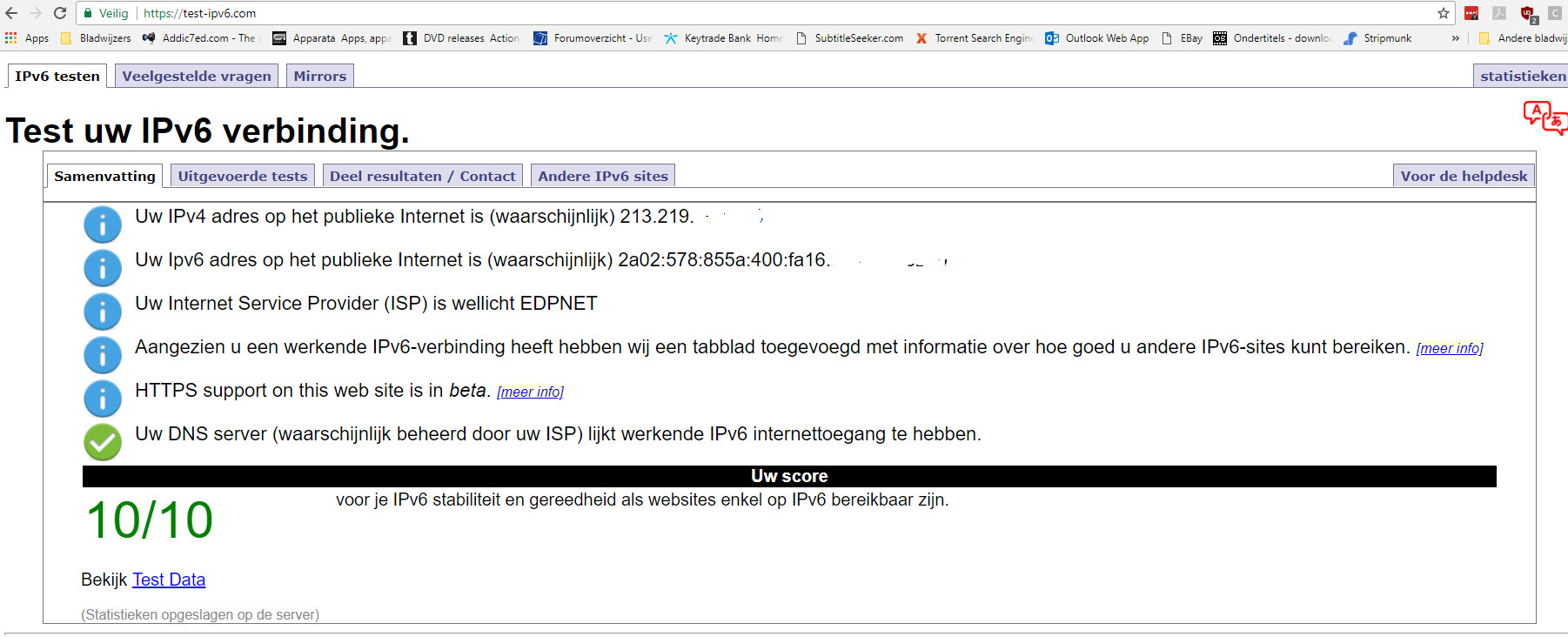 Ondertussen was het wel opgelost, maar toen hielp het aanzetten van IPv6 niet. Dat is toch echt wel een nadeel van de edpnet helpdesk dat ze niet escaleren maar blijven vasthouden dat het probleem bij de klant ligt.