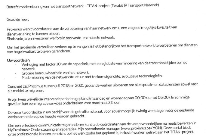Ik heb een brief van Proximus gekregen waarin staat dat ze het transport netwerk willen gaan moderniseren aka project Titan.