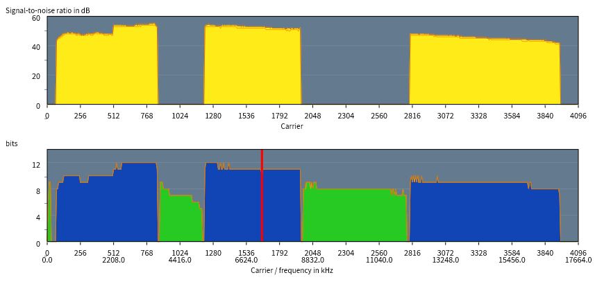 De grafiek is niet echt een momentopname, maar het verloop gedurende 24 uur (snr, resync, fouten).