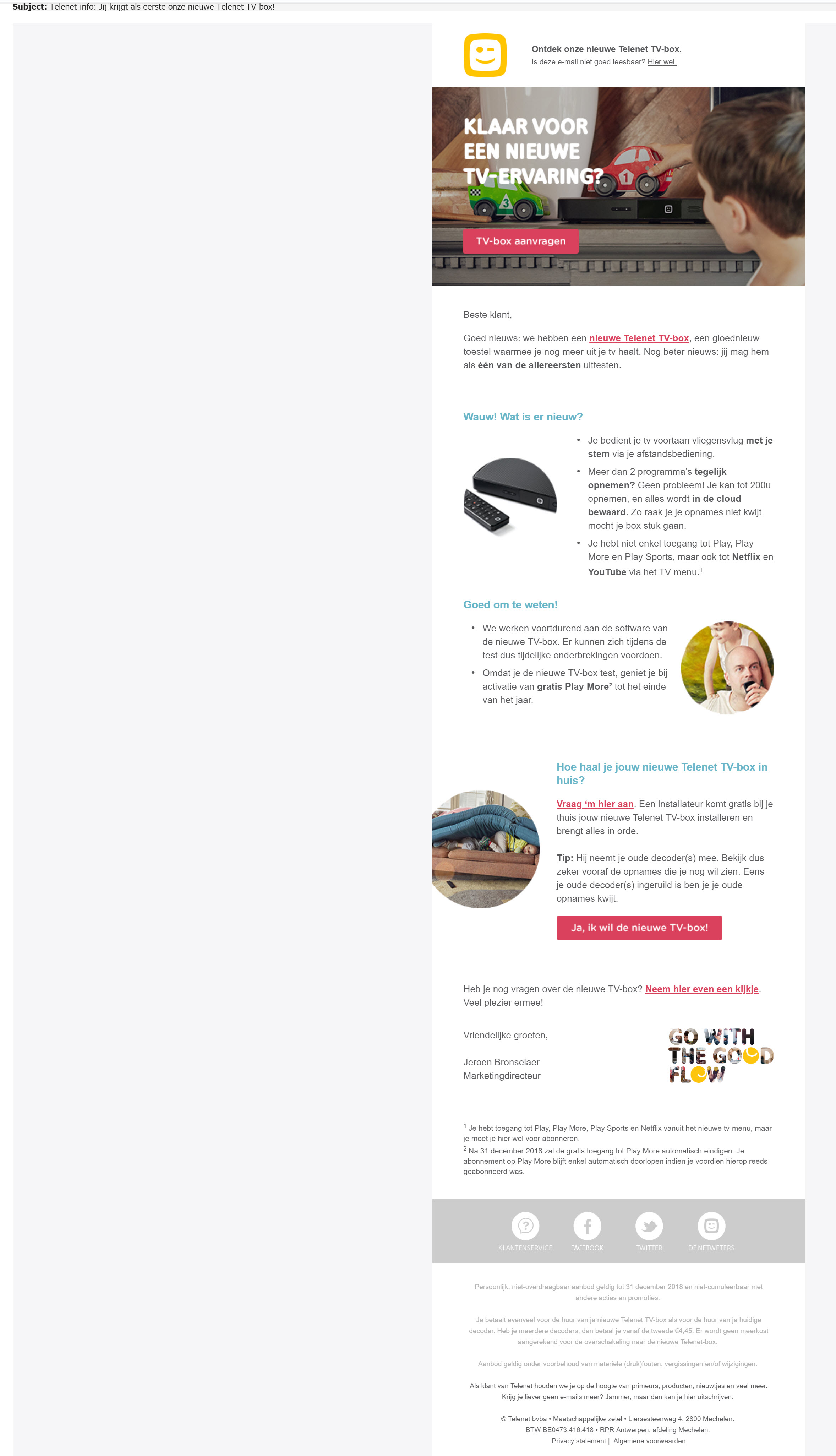 Ze zouden beter investeren in een Yelo-app op Apple TV zoals VOO er nu ook al 1 heeft. Ik geloof niet dat de toekomst van de tv een digicorder is... er zijn bedrijven (zoals Apple en Google) die veel betere hard- en software maken hiervoor, ga daar toch mee in zee en probeer je te differentiëren van je concurrenten op zo’n manieren ipv hopeloos te proberen inhalen wat anderen zoveel beter doen..