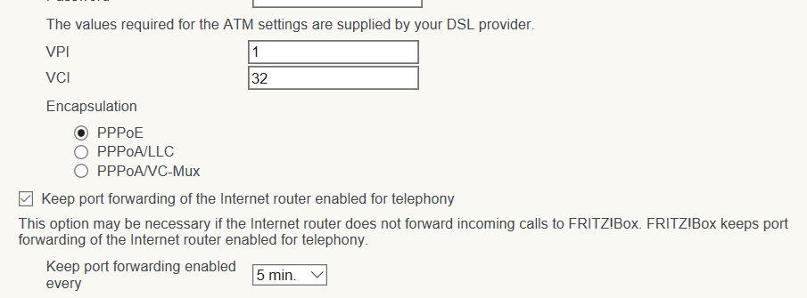 Ik heb VPI op 1, VCI op 32 en Encapsulation op PPPoE laten staan.