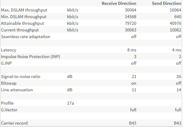 Vectoring is nog niet actief (G.INP = off), wat je denk ik kan proberen te verhelpen door een TBF te starten. Iemand anders zal dit wel met 100% zekerheid kunnen zeggen indien dit zo is.