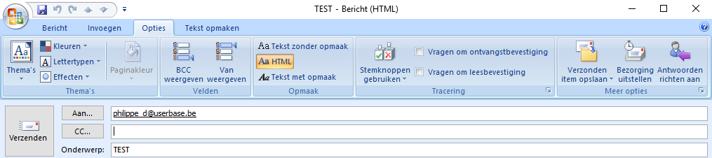 Je kan dit voor iedere te verzenden mail afzonderlijk doen, of gewoon default instellen voor alle mails (Opties > E-mailindeling)