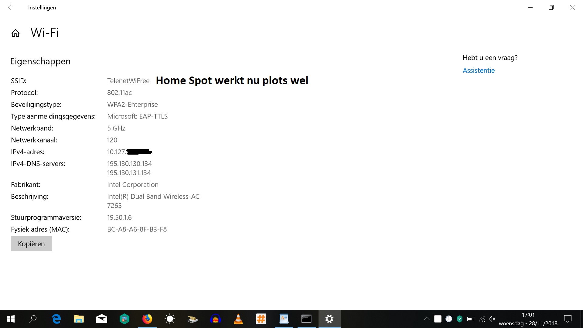 Maar daar gaat mijn probleem niet over , maar dat gaat wel over Telenet Home Spot. Op de zwarte modem zag ik mijn eigen home spot met een sterk signaal wat te verklaren is omdat de laptop (woonkamer) 5 m van de modem staat want die staat op de zolder. En ik dacht dat dit verlopen van dat 5 Ghz kanaal wel op te lossen was door de modem een 10 tal uur zonder spanning te zeggen (lag toch in bed te slapen) en toen de modem uit stond. Heb ik verder zitten surfen via een telenet homespot hier uit de straat waar is net op kan en soms niet want dat signaal is op randje. Maar het lukt wel alleen de snelheid is dan te laag om dat het signaal te zwak is.