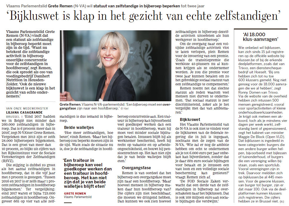 Best grappig. De madam heeft het over de nadelige gevolgen van de bijkluswet ten overstaan van volwaardige zelfstandigen. En wat lees ik dan in de kop van het artikel??? Vlaams parlementslid die ook CEO is van een voedingsbedrijf. Qua uitspraken kan het tellen wat die trezebees verkondigt.