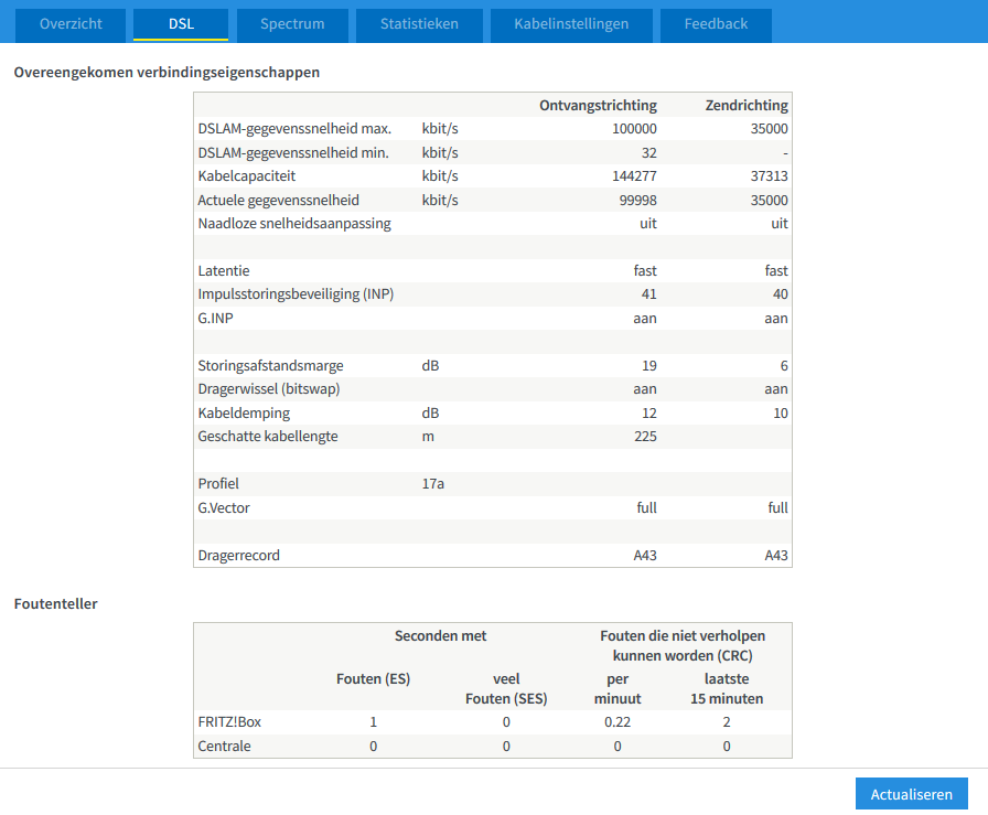 Fritz!Box 7590 op een Duitse Telecom aansluiting met supervectoring 35b (afstand tot de ROP = 226 meter!).