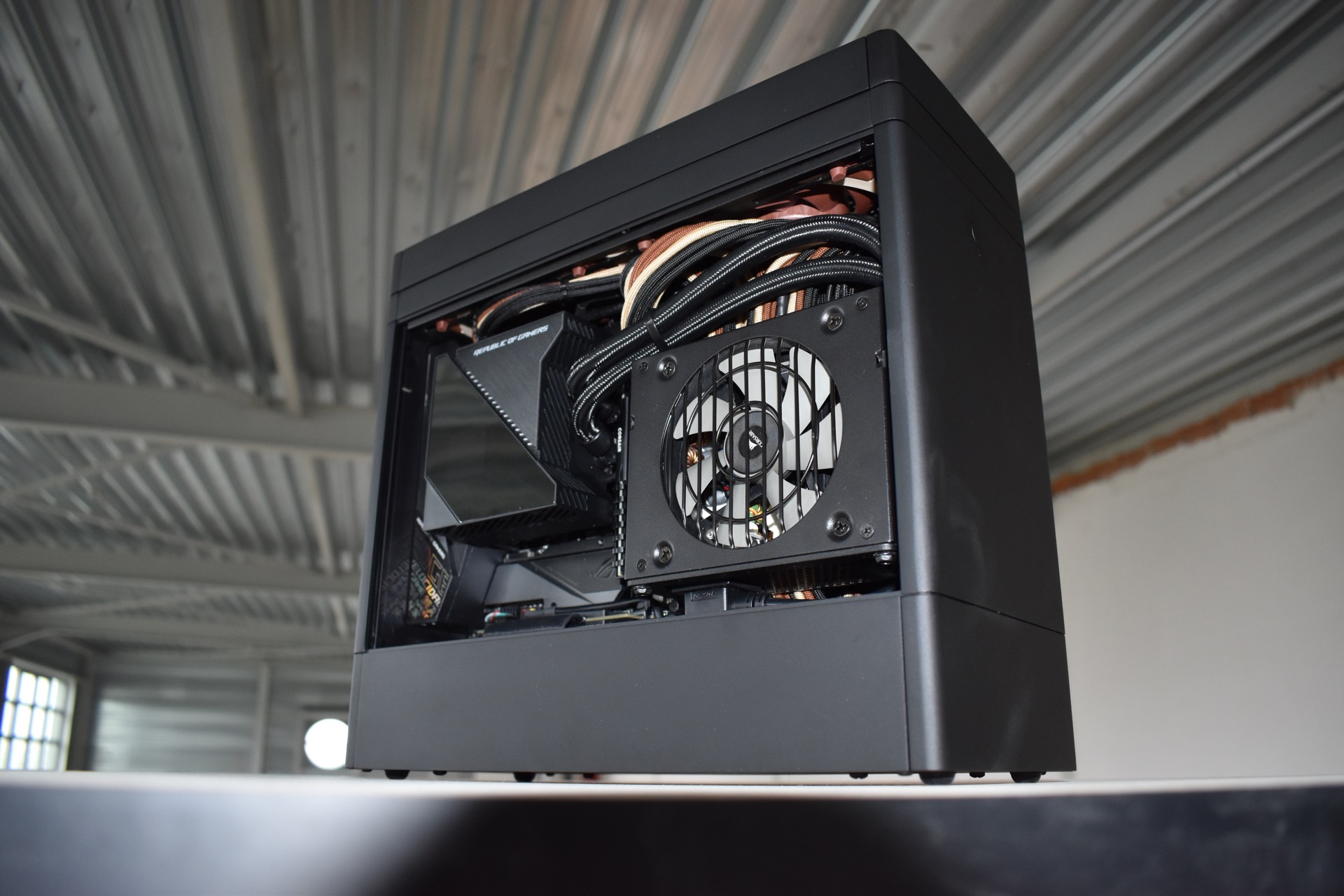 Nieuwe layout in m'n nieuwe SFF case (AIO radiator vanonder en 2x 120mm exhaust fans bovenaan)