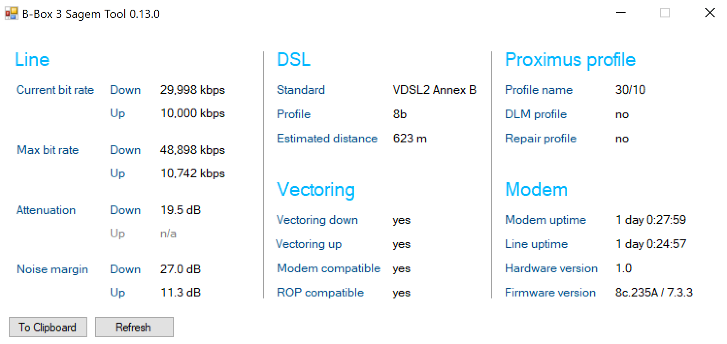 B-Box 3 Sagem Tool v0.13.0 -------------------------- Device: B-Box 3 Sagem Downstream max bit rate: 52,959 kbps Downstream attenuation: 15.8 dB DSL profile: 8b Estimated distance: 454 m Proximus profile name: 40/10