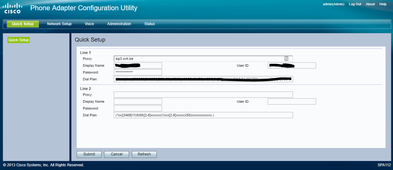 2. Die ATA die ze hebben geplaatst zit dus gewoon op een LAN-poort op de gateway die ze hebben geïnstalleerd. Dat is een Cisco SPA112 die via een web interface te bereiken is. Het frappante is dat je gewoon kan inloggen met een standaard gebruikersnaam en wachtwoord, namelijk telkens admin. Waarna je honderden instellingen kan aanpassen. Zo kan ik zien dat de telefonie gebeurd via OVH. Wat ik me dan ook afvraag (nog niet geprobeerd), wat er gebeurd als ik zou uploaden, wat de gevolgen zijn voor de kwaliteit van de vaste telefonie. Op de gateway zou er QOS moet toegepast worden maar die optie is nergens terug te vinden.