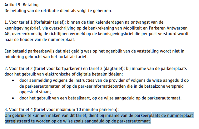 Bij het nalezen van het retributiereglement van Antwerpen heb ik wel degelijk een geldig betalingsbewijs dat ik kan voorleggen wat voldoet aan hun reglement, op mijn naam gezien mijn kaartnr er op staat (alvast de laatste 4 cijfers) en ik kan ook een rekeninguittreksel van mijn creditcard tonen.