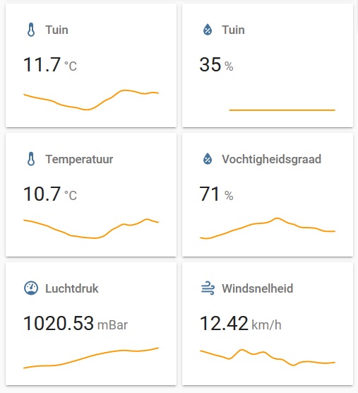Dit is de weergave in HomeAssistant: Tuin is de informatie van de 433Mhz buitensensor, de overige 4 komen van darksky.net.