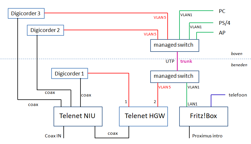 Op basis van jouw beschrijving, hieronder een schemaatje hoe je dit kan oplossen met je bestaande bekabeling en VLAN's.eyeEmotion schreef:De telefoon en 1 digibox staan op gelijkvloers en de rest op 1ste verdiep. Dus 1 utp-kabel kan rechtstreeks naar de digicorder (gelijkvloers), de andere utp-kabel gaat naar boven naar een switch, die op zijn beurt het verdeelt naar de 2 andere digicorders, pc en ps4.