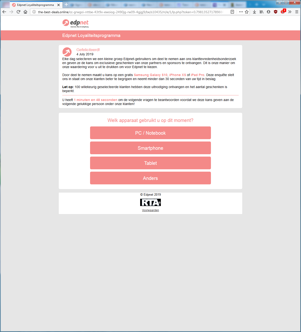 Na het beantwoorden van negen vragen zei de website dat ik een Samsung Galaxy S10 had gewonnen en stelde het voor dat ik €1,50 zou betalen, de verzendingskosten voor de telefoon. Daar ben ik afgehaakt.