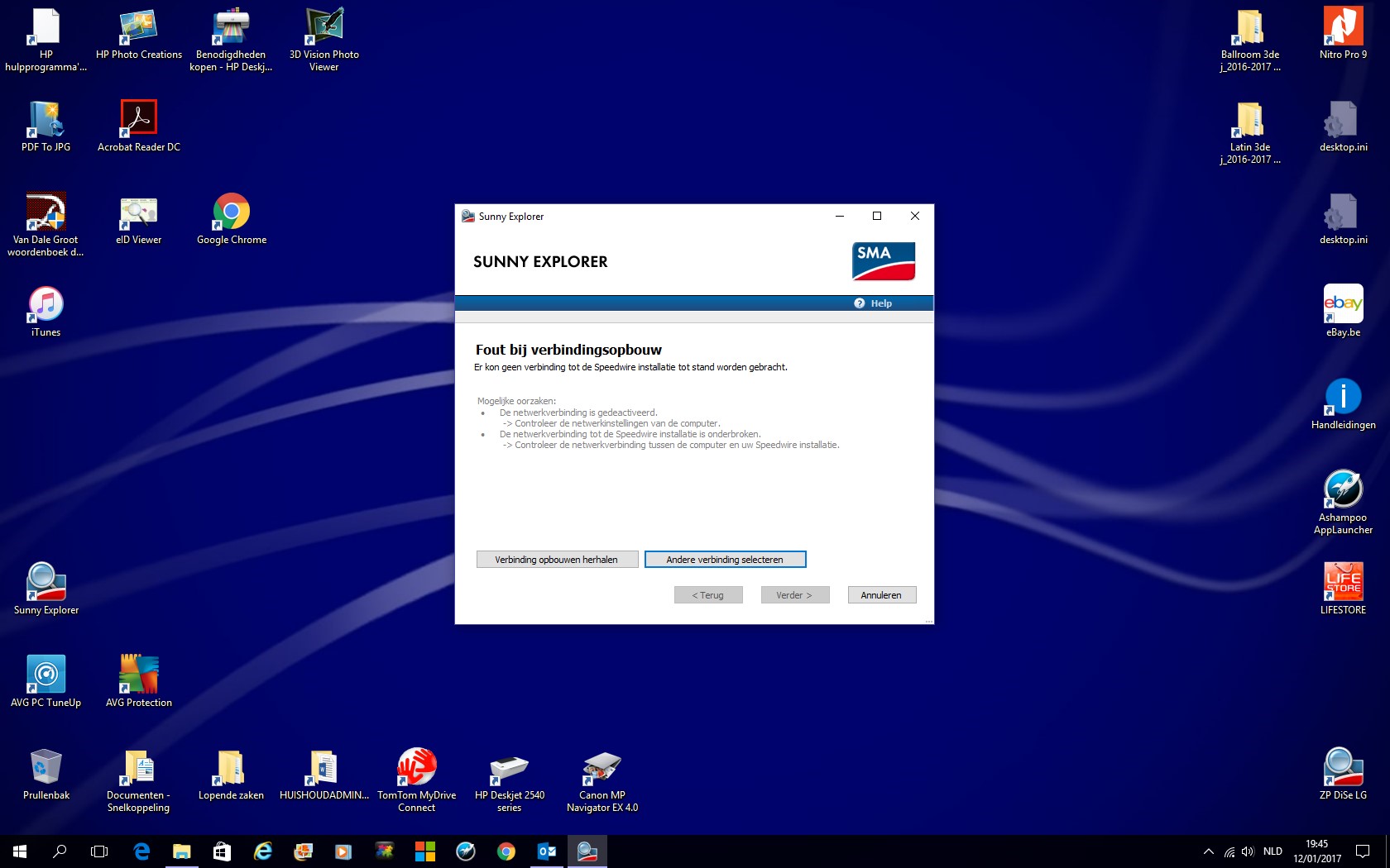 ik zit mij suf te piekeren over het feit dat bij login in Sunny Explorer (monitoring programma van SMA) de omvormer niet met groene vink verschijnt op het scherm, zodat er uiteraard geen gegevens kunnen worden ingeladen (kWh-productie per dag, maand, jaar, totaal,...wat voordien met de b-box 2 perfect verliep.