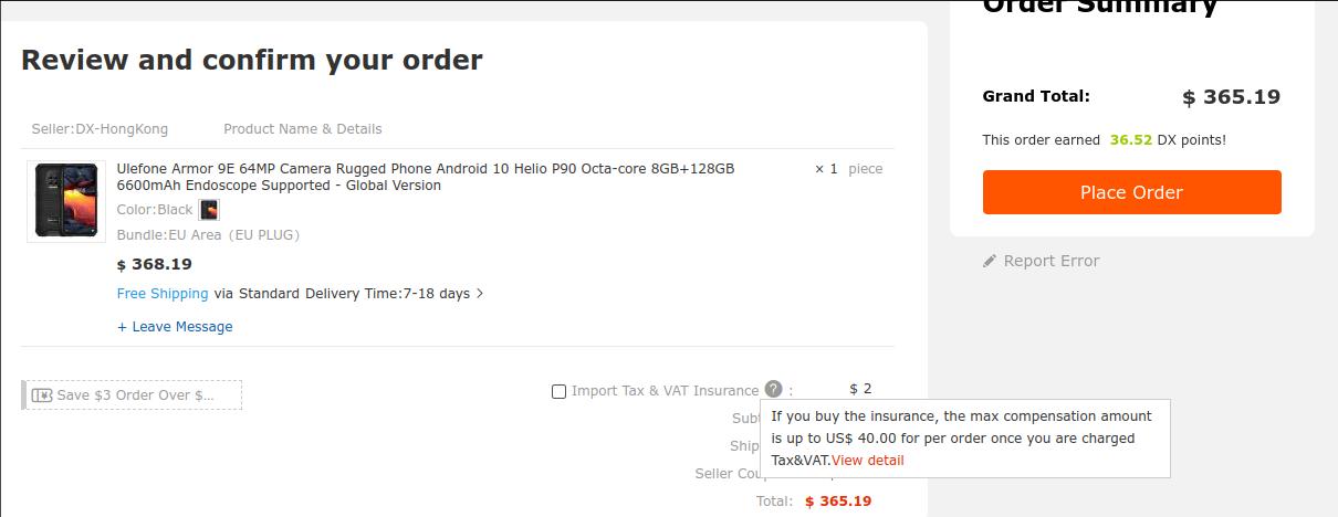 Vroeger kocht ik veel van DX.com - En ik ben eens gaan zien en ja; die bieden nog steeds de optie aan een verzekering af te sluiten.