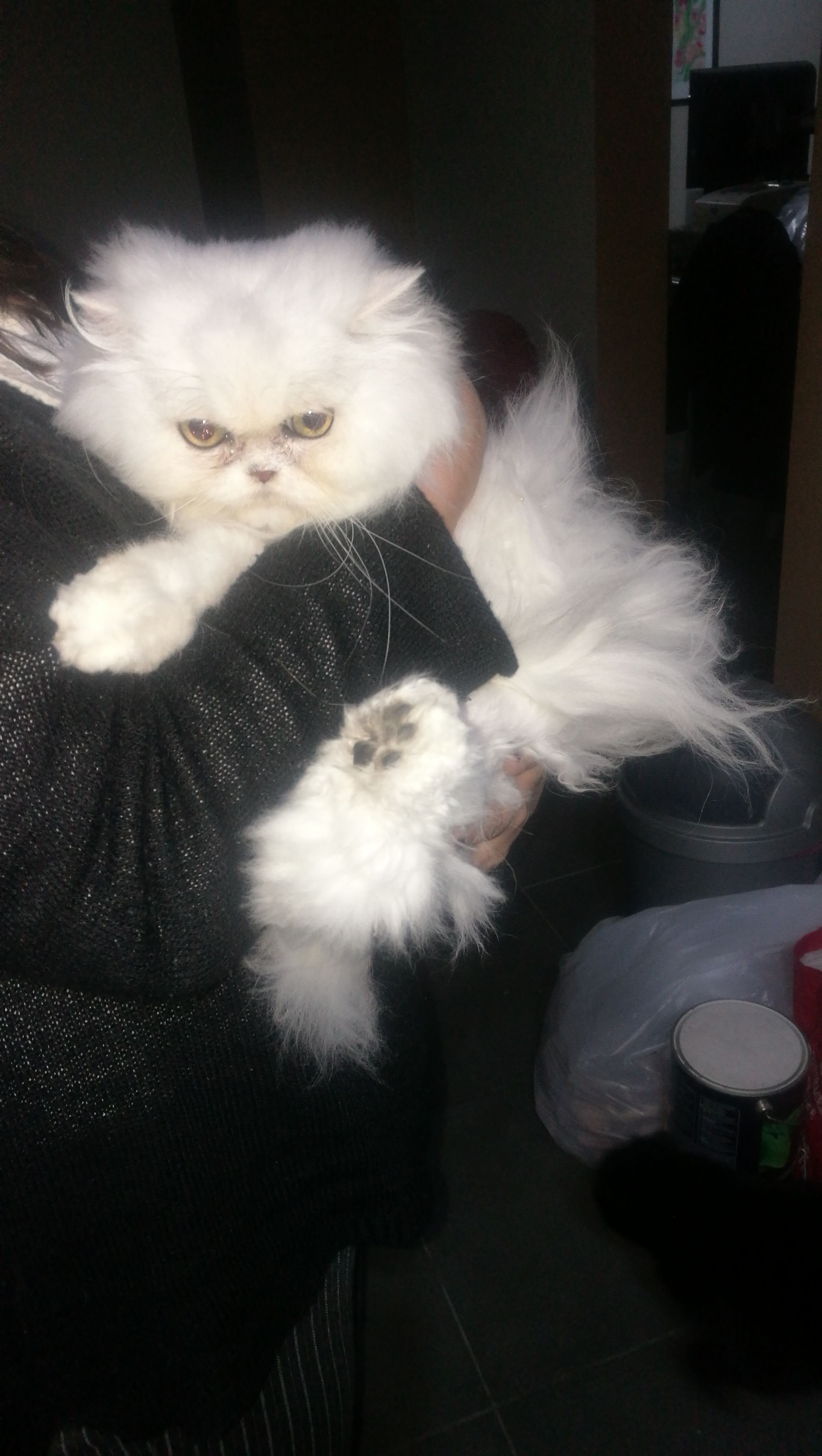 Die heeft zo een gelaatsuitdrukking, idem dito bij mijn Britse korthaar. Je krijgt de indruk dat hij écht boos kijkt maar daar is helemaal niks van aan. Een superlieve pers en erg blij dat ik hem gekocht heb. Straks met zijn boekje naar de dierenarts en hem aan mijn dossier laten toevoegen.