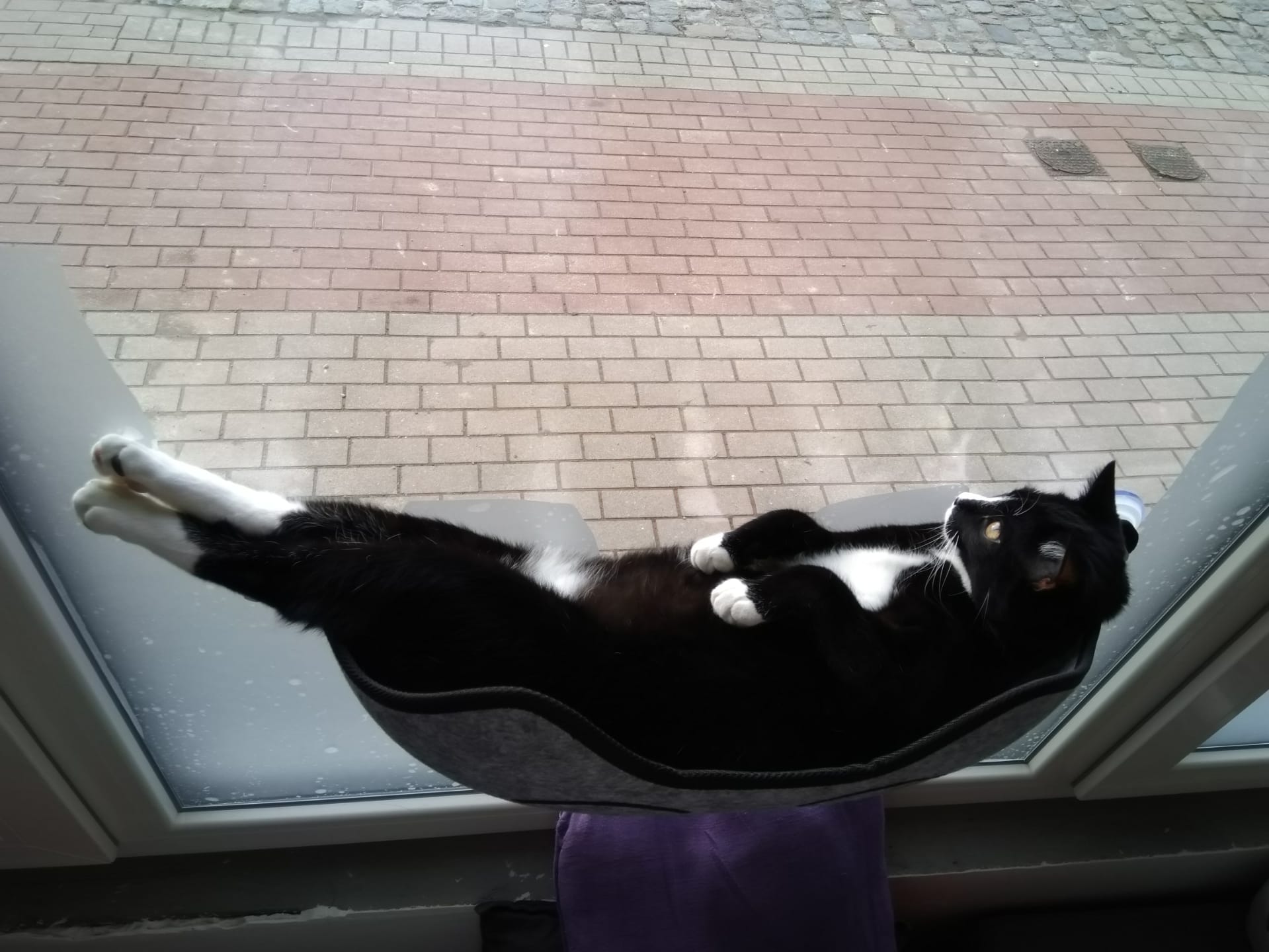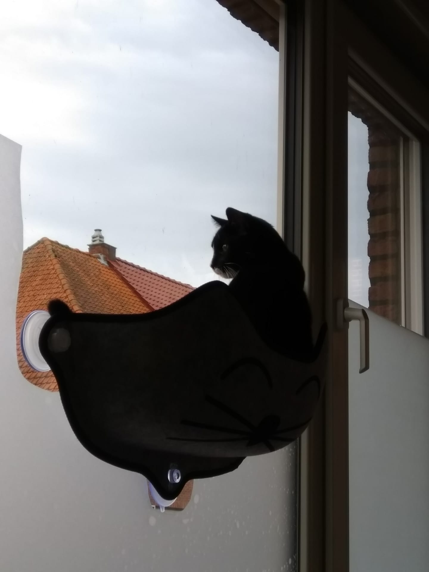Nu kan hij uit elk raam kijken en daar geniet hij van. Achteraan vogeltjes kijken kon hij al vanop zen krabpaal en ton (en nu en dan de kerstboom...), vooraan mensen die passeren uit dat mandje (en hele dag zonnetje want das de zuidkant). Hij ligt er veel in te slapen.