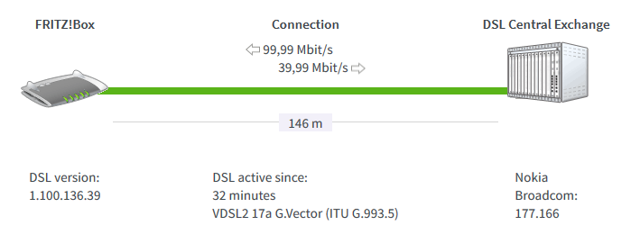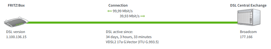 Alles lijkt normaal met de Fritz!Box 7360 v2, logisch want de previous DSL driver 1.100.133.44 wordt gebruikt. Trouwens, vlak voor ik op het fallback-profiel werd gezet waren de lijnwaarden met de "verboden" 1.100.135.16 driver, een stuk beter, ik herinner me dat attainable throughput op 124 Mbps stond.philippe_d schreef:Terwijl je nu toch aan het testen bent, misschien eens op "Annex A" zetten en resultaten vergelijken (nieuwe firmwares >7.01 doen dit automatisch na detectie van een broadcomm DSLAM, schijnt betere resultaten te geven) ?