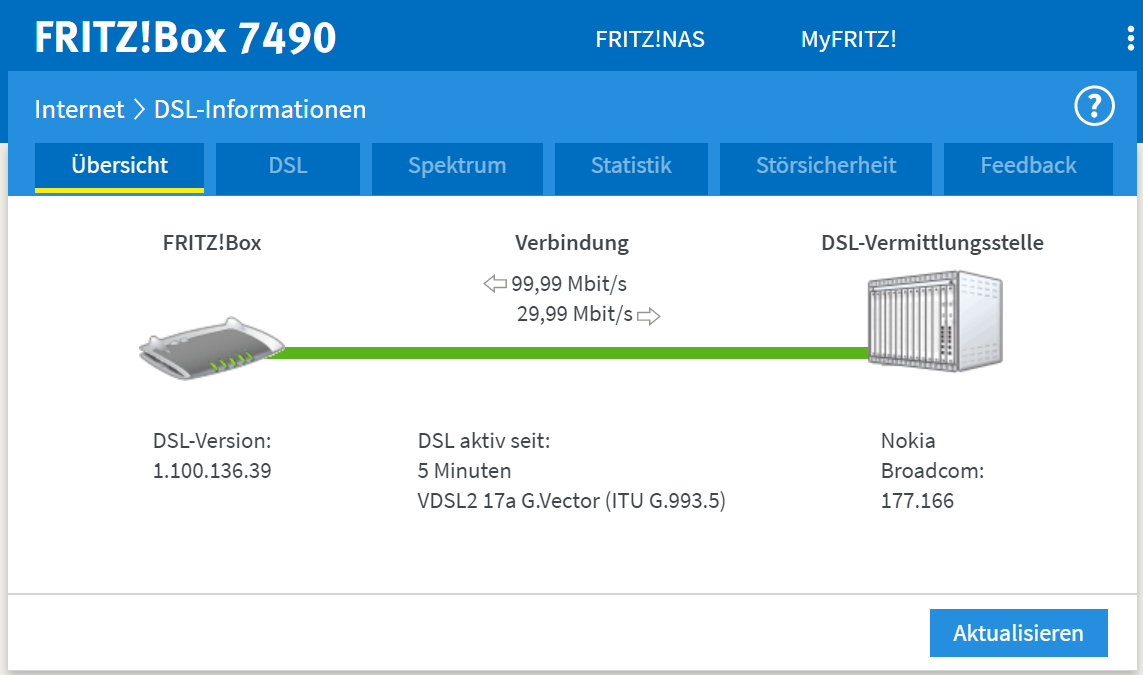 Ik gebruik een Fritzbox 7490 (duitse versie), met Fritz!OS 07.12. De DSL-versie is 1.100.133.44. Ik woon <200m van de telefoonkast.