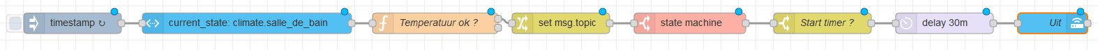 [{"id":"55149c14.4890f4","type":"inject","z":"6a49721.dbb470c","name":"","topic":"","payload":"","payloadType":"date","repeat":"60","crontab":"","once":false,"onceDelay":0.1,"x":120,"y":150,"wires":[["4a2b13ed.3e211c"]]},{"id":"4a2b13ed.3e211c","type":"api-current-state","z":"6a49721.dbb470c","name":"","server":"98e45af.82949a8","version":1,"outputs":1,"halt_if":"","halt_if_type":"str","halt_if_compare":"is","override_topic":false,"entity_id":"climate.salle_de_bain","state_type":"str","state_location":"payload","override_payload":"msg","entity_location":"data","override_data":"msg","blockInputOverrides":false,"x":370,"y":150,"wires":[["6f13ed4a.bc364c"]]},{"id":"6f13ed4a.bc364c","type":"function","z":"6a49721.dbb470c","name":"Temperatuur ok ?","func":"if (msg.payload.current_temperature > msg.payload.target_heat_temperature)\n    return [msg, null];\nelse\n    return [msg, null];","outputs":2,"noerr":0,"x":640,"y":150,"wires":[["12cda7a2.14559"],[]],"outputLabels":["Ja","Nee"]},{"id":"a9ebab2a.64b3f","type":"state-machine","z":"6a49721.dbb470c","name":"","triggerProperty":"topic","triggerPropertyType":"msg","stateProperty":"topic","statePropertyType":"msg","outputStateChangeOnly":true,"throwException":false,"states":["wait","timer"],"transitions":[{"name":"setpoint_reached","from":"wait","to":"timer"},{"name":"finished","from":"timer","to":"wait"}],"x":1005,"y":150,"wires":[["e43e6994.e53738"]]},{"id":"12cda7a2.14559","type":"change","z":"6a49721.dbb470c","name":"","rules":[{"t":"set","p":"topic","pt":"msg","to":"setpoint_reached","tot":"str"}],"action":"","property":"","from":"","to":"","reg":false,"x":820,"y":150,"wires":[["a9ebab2a.64b3f"]]},{"id":"e43e6994.e53738","type":"switch","z":"6a49721.dbb470c","name":"Start timer ?","property":"topic","propertyType":"msg","rules":[{"t":"eq","v":"timer","vt":"str"}],"checkall":"true","repair":false,"outputs":1,"x":1195,"y":150,"wires":[["fdee2c3b.156da8"]]},{"id":"fdee2c3b.156da8","type":"delay","z":"6a49721.dbb470c","name":"","pauseType":"delay","timeout":"30","timeoutUnits":"minutes","rate":"1","nbRateUnits":"1","rateUnits":"second","randomFirst":"1","randomLast":"5","randomUnits":"seconds","drop":false,"x":1370,"y":150,"wires":[["c09744ad.8400e"]]},{"id":"c09744ad.8400e","type":"api-call-service","z":"6a49721.dbb470c","name":"Uit","server":"98e45af.82949a8","version":1,"debugenabled":false,"service_domain":"","service":"","entityId":"","data":"","dataType":"json","mergecontext":"","output_location":"","output_location_type":"none","mustacheAltTags":false,"x":1525,"y":150,"wires":[[]]},{"id":"98e45af.82949a8","type":"server","z":"","name":"Home Assistant","legacy":false,"hassio":true,"rejectUnauthorizedCerts":true,"ha_boolean":"y|yes|true|on|home|open","connectionDelay":false}]