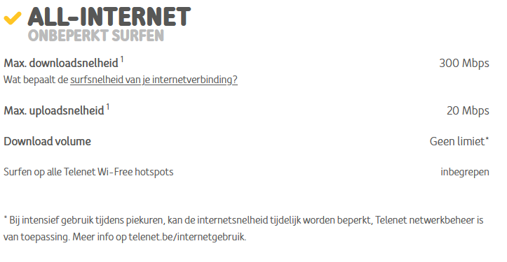 Er is wel degelijk een limiet, na 750GB geen 300/20Mbps meer, maar er staat tenminste een sterretje met uitleg. De beschrijving bij orange gaat compleet de mist in en vermeld niets van beperkingen, terwijl die dezelfde zijn als telenet.