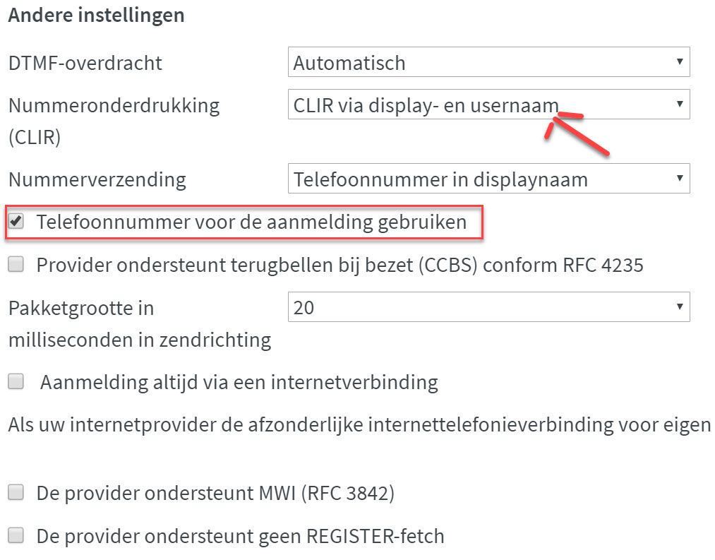 - In de Fritz!Box stel je uw vast nummer in als caller-id (met de aangevinkte optie zoals hierboven).