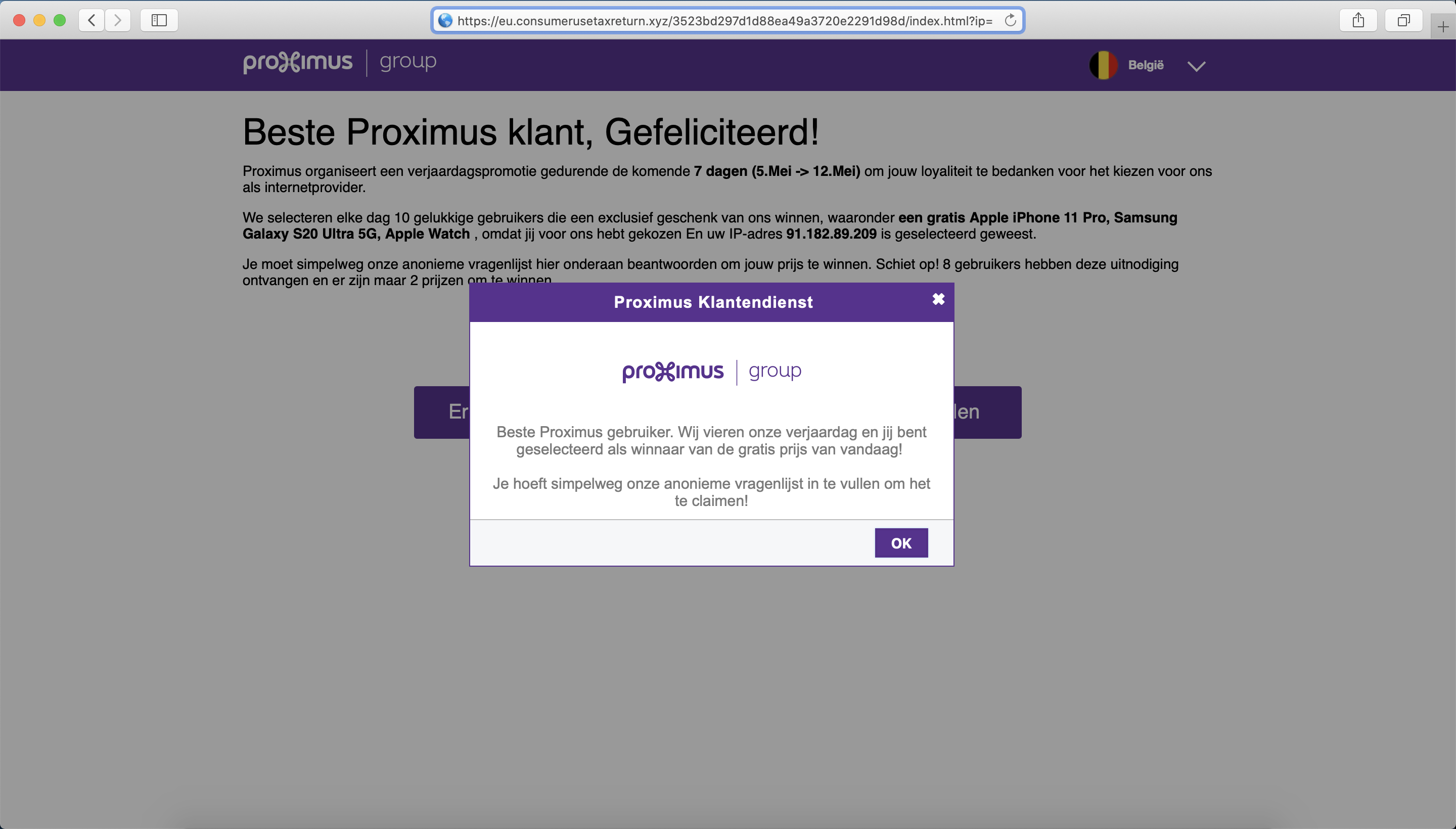 Ik merk af en toe dat ik ongewenst doorverwezen wordt naar een website die lijkt alsof die van Proximus komt en waar ik zogezegd een prijs heb gewonnen. Dit gebeurt nog maar sinds 2 weken en dat valt samen met het moment dat we Proximus geworden zijn met onze vaste diensten.