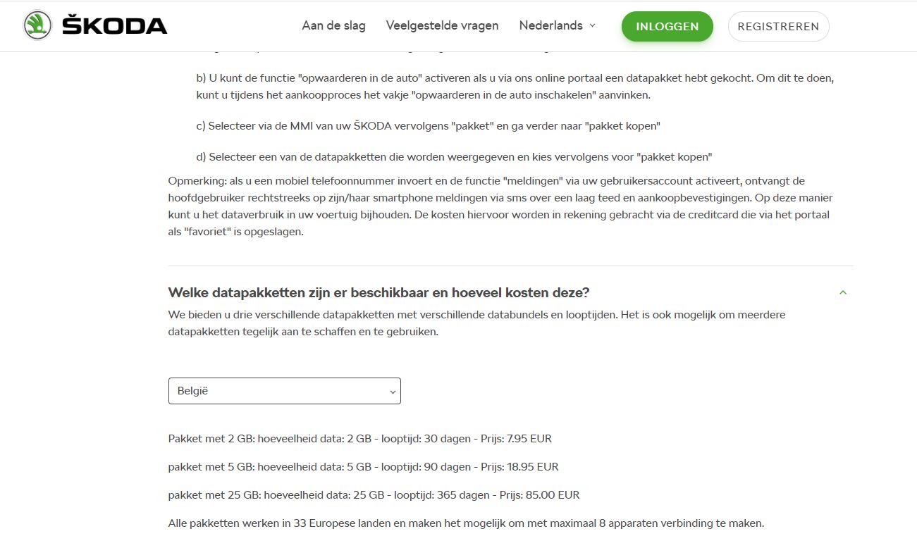In mijn wagen zit een modem met simkaart. De eerste weken is dat gratis maar nadien moet je data bijkopen. Ik kan echter nergens de prijzen vinden van deze databundels op de website van Proximus. Het enige dat ik kan vinden is dit: https://www.proximus.be/nl/id_cr_data_o ... pties.html maar het is onduidelijk of dit ook voor modems in wagens geldt.
