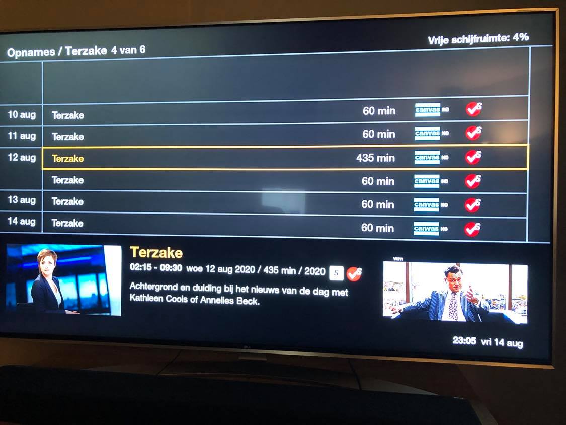 Heb ik nog nog nooit voorgehad en ik programmeer wel elke dag minstens iets.proximusboyke schreef: Als je graag hebt datie een programma 5 x opneemt of een ganse nacht opneemt of iets opneemt dat ge niet vraagt