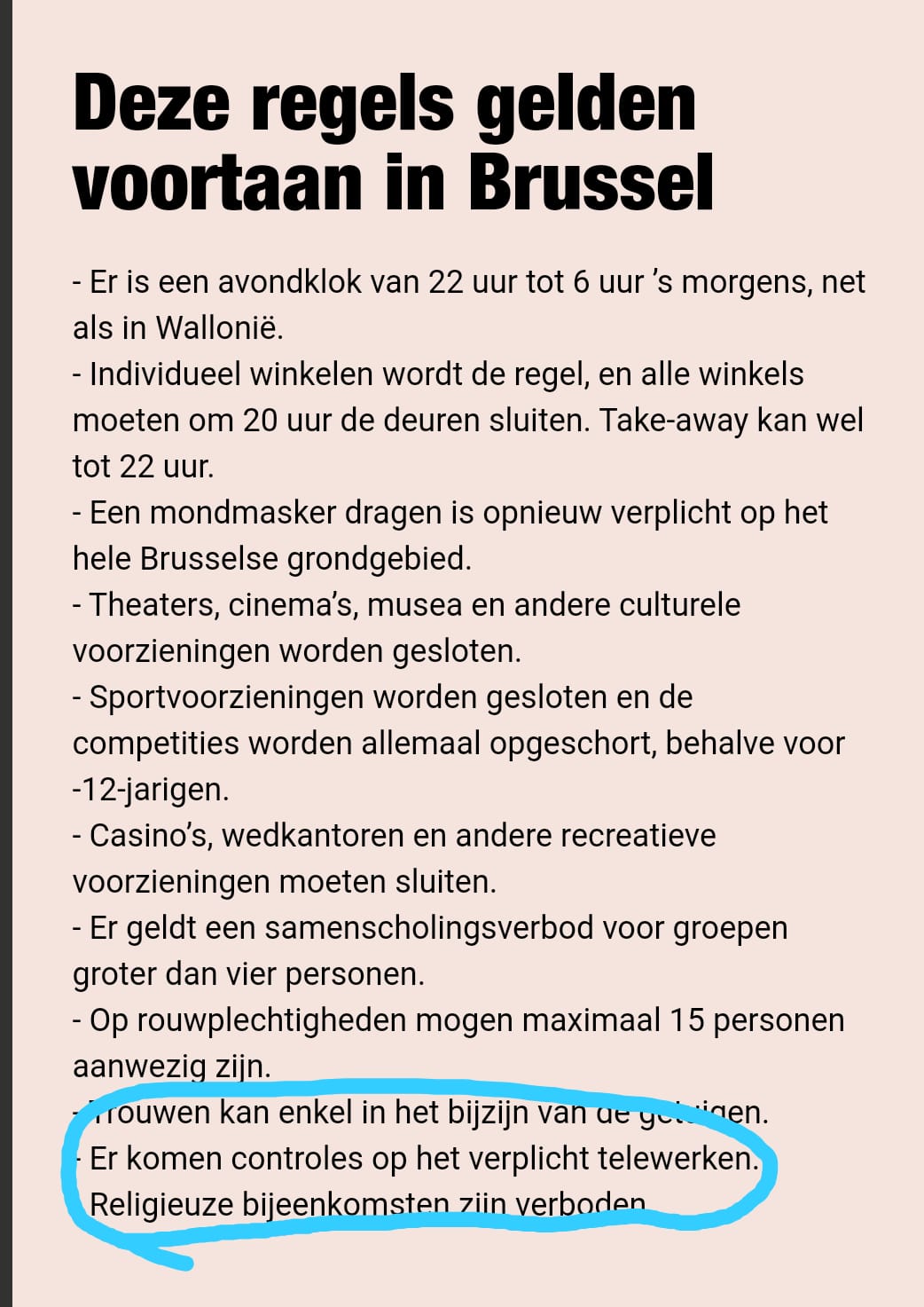 Deze tweet blijft van toepassing wat betreft het grondgebied buiten het Brussels gewest.satsurfer schreef:tweet van voor het overlegcomité van 22/10