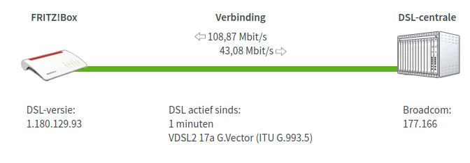 Bij het alles instellen in de Fritz8box modem 7530, kort na een geslaagde VDSL connectie gekeken naar de DSL waarden, zag ik tot mijn grote verbazing bijna 109 Mbit/s download en 43 Mbit/s upload. Heb wel geen print screen genomen van de lijnwaarden.
