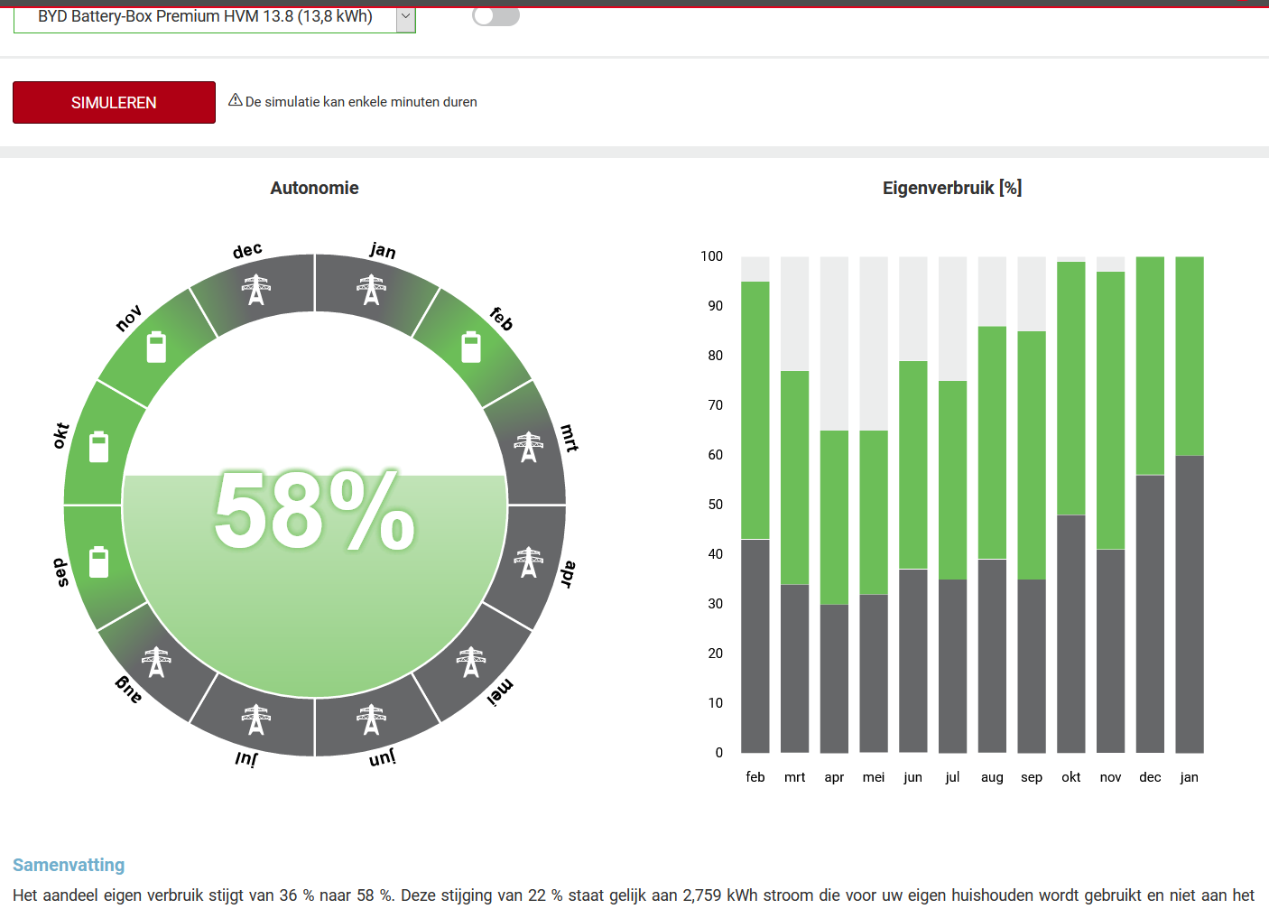Als ik een simulatie maak met een 13kw batterij kom ik aan een eigen verbruik verhoging van 22%, wat neer komt op 500euro per jaar. Aan de levensduur van de batterij van 10 jr als ze 100% capaciteit behoud (wat niet het geval is) kom je maar aan 5000 euro uitgespaard. De batterij zal meer dan 7000 euro kosten...