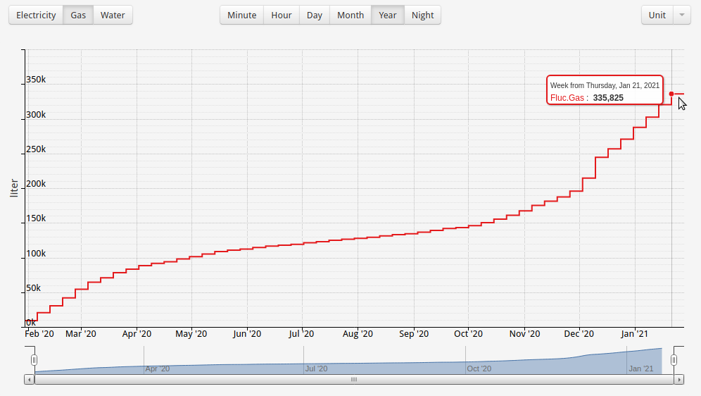 Tussen 05/12/2020 en 26/01/2021 zitten we aan 8,3m3 / dag.