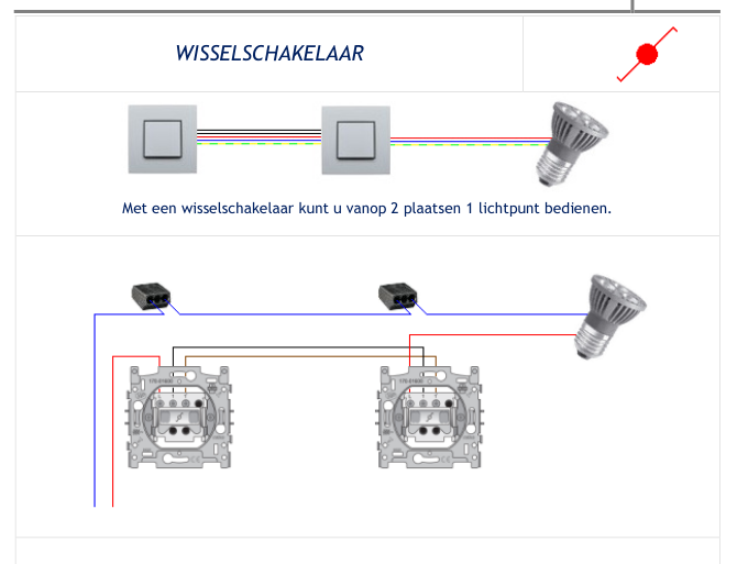 Het gaat daarbij om een lichtpunt met 2 schakelaars volgens wisselschakelaar principe. De bedrading bij mij zit wellicht zo in mekaar: