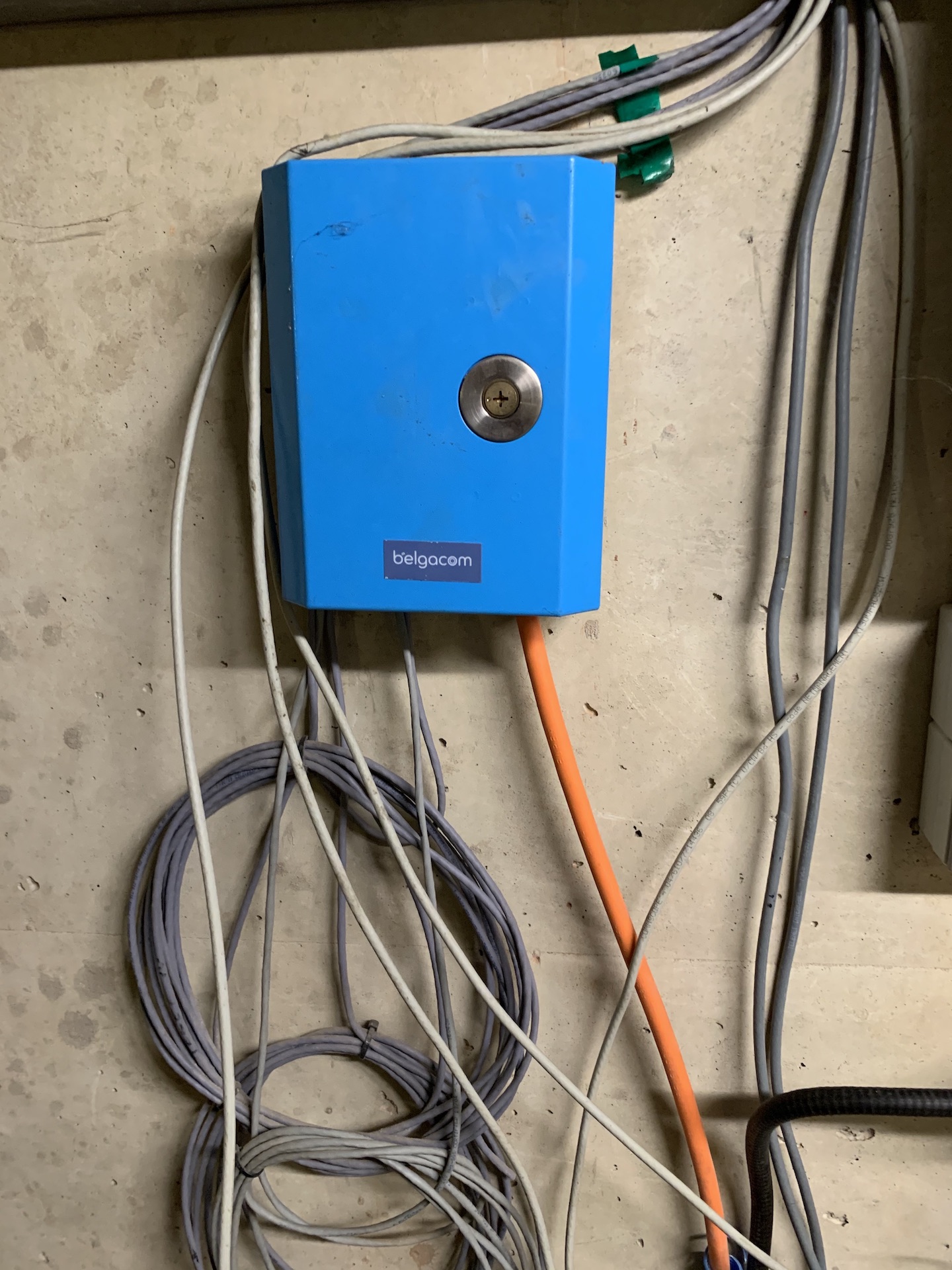 In de slaapkamers en de living zijn er RJ45-aansluitingen in de klassieke Niko-wanddoosjes. Deze 'uiteindes' waren echter nergens te vinden, maar na openschroeven werd duidelijk dat enkel de kabelparen voor telefoon zijn aangesloten. Beneden in de kelder heb ik een Belgacom introdoos gevonden, met eenzelfde blauwe UTP-kabel. Deze is echter nog niet aangesloten in de doos, maar hangt er los naast.