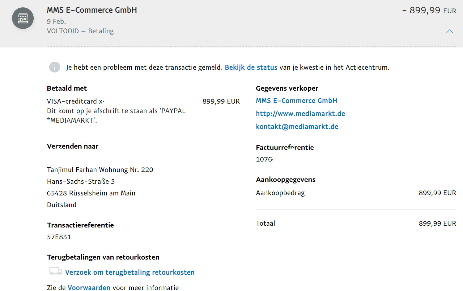 3321,93 € van mijn visa gehaald via paypal (Mediamarkt.de)