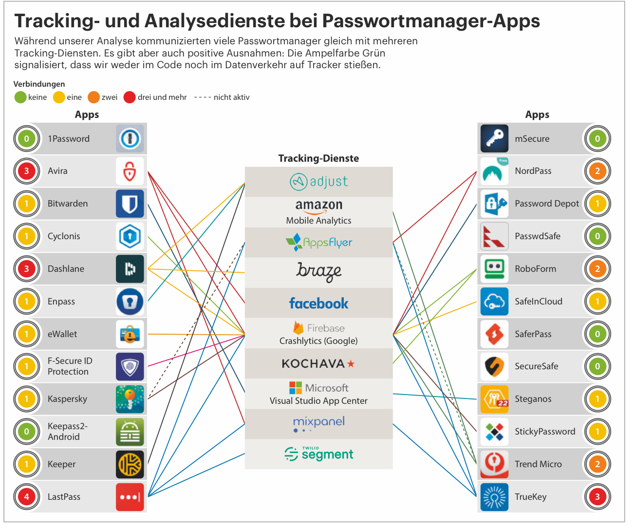 Bijgevoegd een overzicht van de trackers in de password managers. Ze hebben trouwens ook 25 password managers getest in dezelfde uitgave.