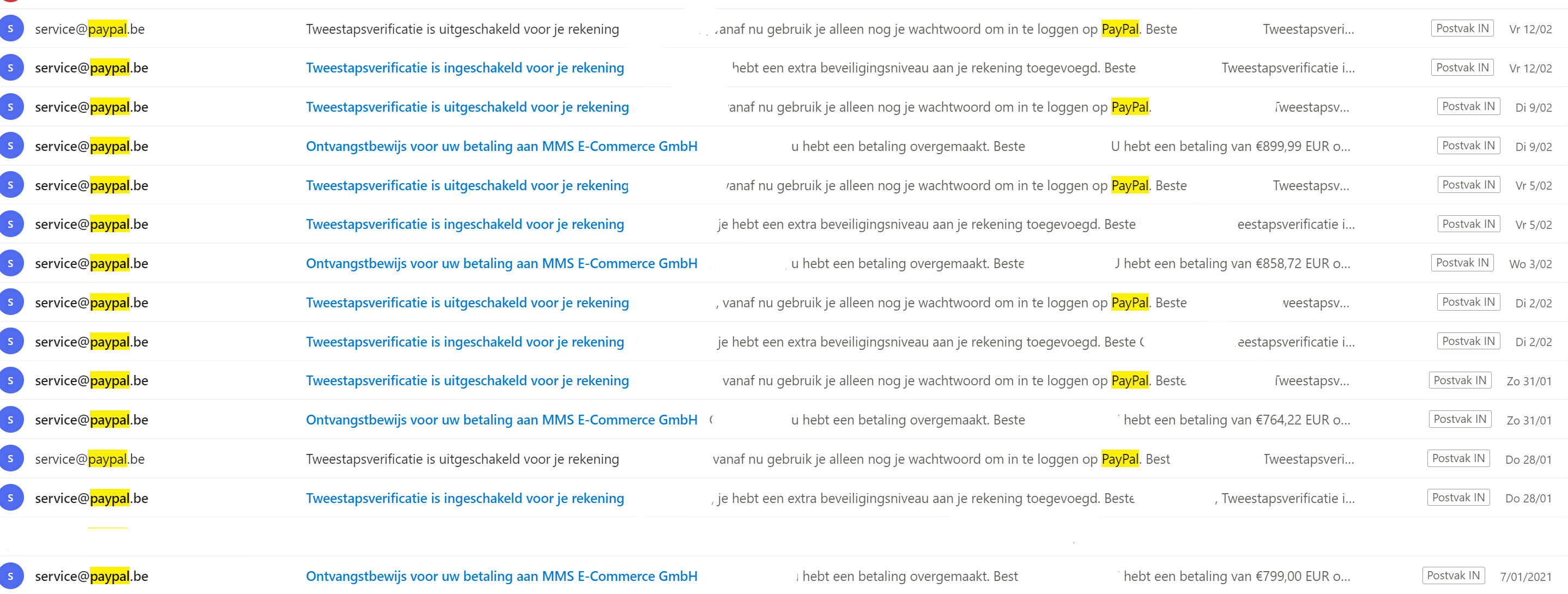 Bedankt voor de constructieve feedback en niet de 'beschuldigende' toon. Ik had iets minder 'nonchalant' moeten zijn in nakijken paypal + al véél langer PW gewijzigd hebben. Als ik soms lees dat mensen hun ganse pensioen er door jagen door phishing en van bank krijgen ze niets terug...Tja, om rillingen van te krijgen. Dus ik dacht eerlijk gezegd. Dit komt niet goed.