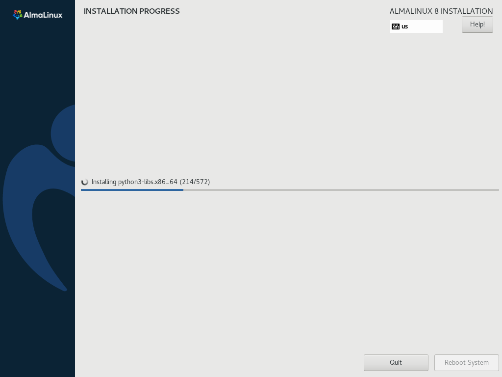 Op 't eerste zicht is de installer van almalinux zo goed als identiek als CentOS 7 & 8, enkel een ander logo links.