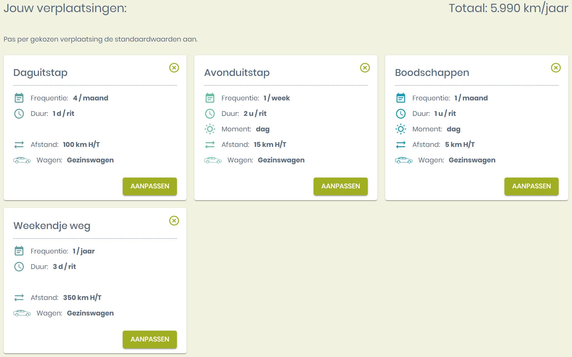 Aan de hand van de voorspelde verplaatsingen en de aankoop van een eigen wagen + onkosten maakt deze tool een berekening en maakt een vergelijking per jaar of per kilometer.