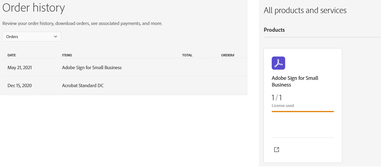 Onder orders zie ik zowel het order van Acrobat als Sign staan. Onder All Products and Services zie ik enkel de Sign licentie staan. Ik kan daar wel Acrobat licenties bijkopen, maar de prijs is verschillend en ik ben bang dat ik dan weer zaken op verschillende subaccounts ga zetten.