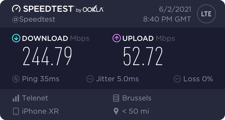 Hoogste LTE downspeed tot hiertoe is 338 Mbps Upload lijkt een cap te hebben op +/- 40Mbps, tenzij er iemand al over geraakt is.