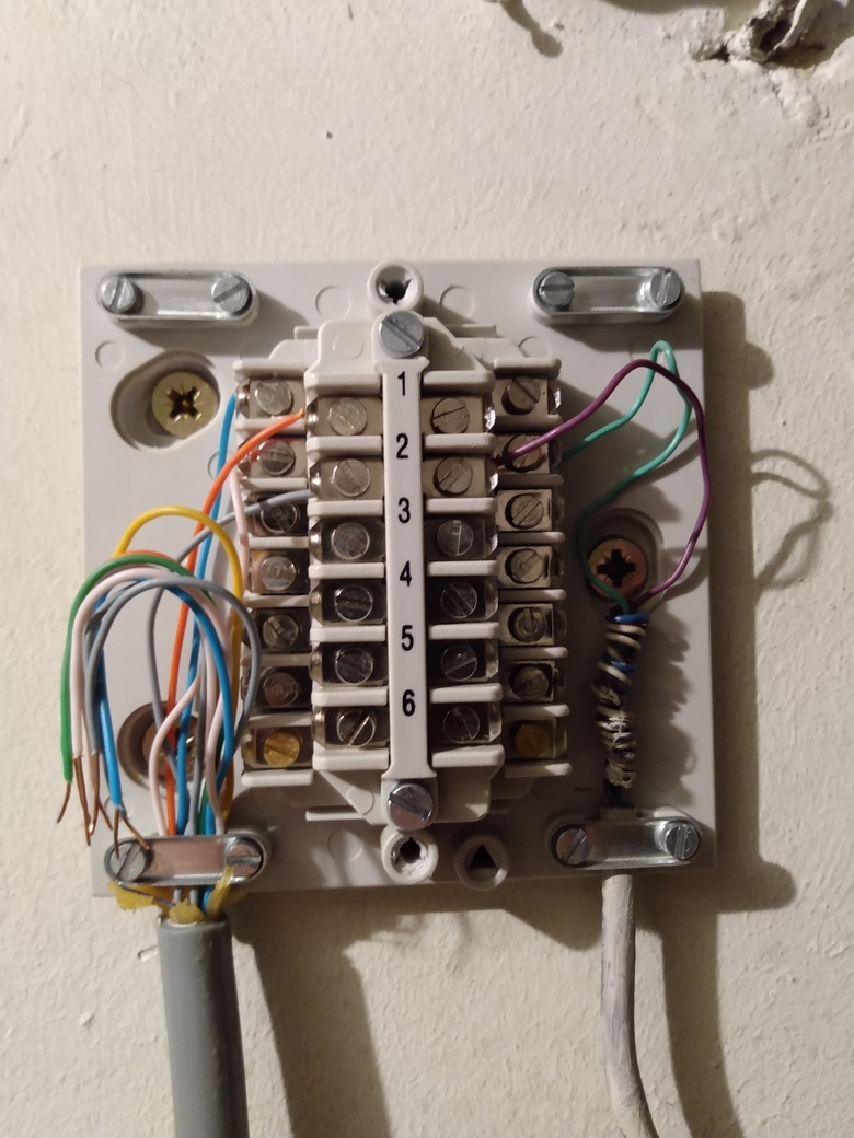 Het appartement had nog steeds een van die oude 5-polige telefooncontactdozen. Volgens EDPnet werkt dit helemaal niet voor DSL of als het dat doet, zal de snelheid extreem laag zijn. Dus ik heb een TF2007 uit een Proximus-winkel (genoemd NTP2007 op de website van EDPnet, maar TF2007 op de Proximus-verpakking; het ziet er hetzelfde uit en blijkbaar is het hetzelfde) en ik heb het geïnstalleerd in plaats van de oude doos volgens de installatie-instructies van EDPnet. Ik verbond de twee kabels (groen en paars) die waren bevestigd aan A en B van de oude doos aan A en B op het zwarte blok van de TF2007. Helaas, de FRITZ!Box kan daarmee geen verbinding tot stand brengen. Ik heb het ook geprobeert met de kabels omgekeerd, alsook met de eerder ongebruikte kabels (grijs en blauw). Geen geluk.