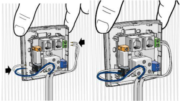 de groene of blauwe klem hangt er van af of je en splitter hebt. indien geen splitter de groene. indien je er wel een hebt MOET je de blauwe gebruiken. als je geen telefoon hebt is het soms beter om die splitter weg te halen. op deze manier kan de splitter niet voor problemen zorgen.