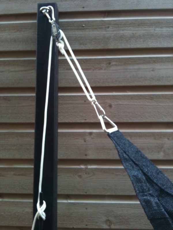 Om in hoogte te verstellen katrollen gebruiken aan de palen met een vlaggenmasthaak - ook makkelijk om deze neer te laten bij slecht weer.
