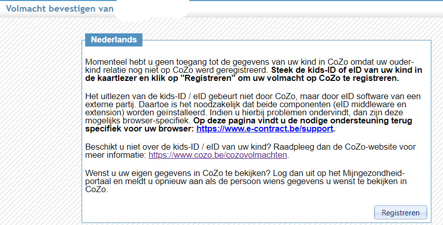 In mijngezondheid.be kan een ouder inloggen en na de identificatiestap kiezen om in te loggen als een van de kinderen. Dropdown-menu. Mogelijk zit in mijngezondheid ook wat in cozo zou zitten. De corona-certificaten van de kinderen zitten daar.
